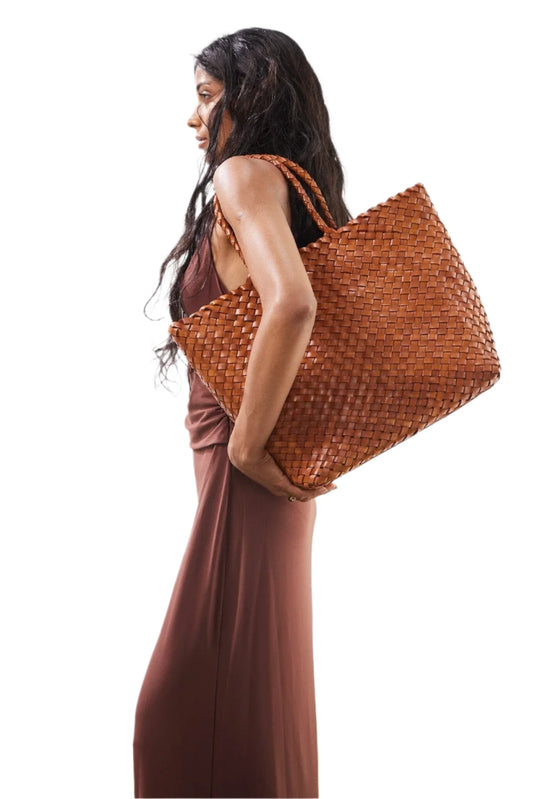 Patina Large Cedar - Woven Leather Bag in Dark Brown
